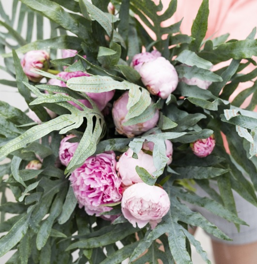 Peonies in a bouquet with Phlebodium: a surprising and simple combination with these big grey leaves. We often start with the flower - what foliage fits well with this flower? But sometimes it’s also good to start from the foliage. So ask yourself: what foliage shall I use? Gather a few types of foliage and then consider what flower would be the perfect match. You will find that you produce different combinations than before. We think that the peony looks stunning in this combination with Phlebodium.